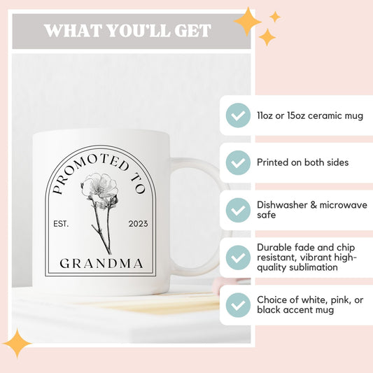 Vintage Floral Coffee Mug, Promoted to Grandma Mug, Pregnancy Announcement, Baby Announcement, Mom to Grandma, Custom New Grandmother Giftg